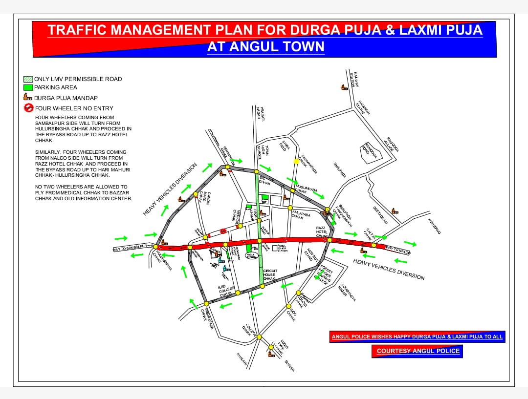 ଅନୁଗୁଳ ଟାଉନରେ ଦୁର୍ଗା ପୂଜା ଏବଂ ଲକ୍ଷ୍ମୀ ପୂଜା ମହୋତ୍ସବର ସୁଗମ ଏବଂ ସୁବିଧାଜନକ ପରିଚାଳନା ପାଇଁ ନିମ୍ନଲିଖୂତ ଟ୍ରାଫିକ୍ ପରାମର୍ଶ ଜାରି କରାଯାଇଛି |କୌଣସି ସାଧାରଣ ଚାରି ଚକିଆ ଯାନ ବାହାନ ଗୁଡିକୁ ରାଜ୍ ହୋଟେଲ ଛକ ଠାରୁ ହୁଲସୁରିଙ୍ଗା ଛକ ପର୍ଯ୍ୟନ୍ତ ୫୫ ନମ୍ବର ଜାତୀୟ ରାଜପଥରେ ଅପରାହ୍ନ ୪ ଘଟିକା ରୁ ରାତ୍ର ୧୨ ଘଟିକା ପର୍ଯ୍ୟନ୍ତ ଯିବାକୁ ଅନୁମତି ଦିଆଯିବ ସମ୍ବଲପୁର ପାର୍ଶ୍ୱରୁ ଆସୁଥିବା ସମସ୍ତ ଭାରି ଯାନ ଓ ଅନ୍ୟ ଚାରି ଚକିଆ ଯାନ ବାହାନ ଗୁଡିକ ହୁଲୁରିସିଙ୍ଗା ଛକରୁ ରାଜ୍ ହୋଟେଲ ଛକକୁ, ଗାନ୍ଧୀମାର୍ଗ – ହେମସୁରପଡା ରାସ୍ତା ଦେଇ ଯାଇ ପାରିବେ । ସମସ୍ତ ହାଲୁକା ଚାରି ଚକିଆ ଯାନ ବାହାନ ଗୁଡିକ DIC ଛକରୁ ବାସନ୍ତୀ ଦୂର୍ଗାପୂଜା ପଡିଆ ପର୍ଯ୍ୟନ୍ତ ଆସି, ସେଠାରେ ଗାଡି ପାର୍କିଂ କରିପାରିବେ ।ନାଲକୋ ପାର୍ଶ୍ବରୁ ଆସୁଥିବା ସମସ୍ତ ଭାରି ଯାନ ଓ ଅନ୍ୟ ଚାରି ଚକିଆ ଯାନ ବାହାନ ଗୁଡିକ ରାଜ ହୋଟେଲ ଛକରୁ ହୁଲରିସିଙ୍ଗା ଛକ – ତାମ୍ରିତ କଲୋନୀ – ସର୍କିଟ ହାଉସ୍ ଛକ – ବି.ଇ.ଡି ଛକ – ମିଶ୍ର ପଡା ଛକ ଦେଇ ହରିମହୁରୀ ଛକ ଠାରେ ୫୫ ନମ୍ବର ଜାତୀୟ ରାଜପଥରେ ପହଞ୍ଚି ପାରିବେ । ସମସ୍ତ ହାଲୁକା ଚାରି ଚକିଆ ଯାନ ବାହାନ ଗୁଡିକ ସର୍କିଟ ହାଉସ ଛକରୁ ଥାନା ଛକ ଦେଇ ଅନୁଗୁଳ ହାଇ ସ୍କୁଲପଡିଆ( ଷ୍ଟାଡିଅମ ସାମ୍ନା) ପର୍ଯ୍ୟନ୍ତ ଆସି, ସେଠାରେ ଗାଡି ପାର୍କିଂ କରିପାରିବେ ।ମହୀଧରପୁର ପାର୍ଶ୍ବରୁ ଆସୁଥିବା ସାଧାରଣ ଚାରି ଚକିଆ ଯାନ ବାହାନ ଗୁଡିକ ସବ୍ କଲେକ୍ଟର ରେସିଡେନ୍ସ ଠାରୁ ନୂଆ ବସ୍ ଷ୍ଟାଣ୍ଡ ଆଡକୁ ଯାଇପାରିବେ କିମ୍ବା ସର୍କିଟ ହାଉସ ଛକ ଠାରୁ ଥାନା ଛକ ଦେଇ ଅନୁଗୁଳ ହାଇ ସ୍କୁଲ ପଡିଆ( ଷ୍ଟାଡିଅମ ସାମ୍ନା) ପର୍ଯ୍ୟନ୍ତ ଆସି, ସେଠାରେ ଗାଡି ପାର୍କିଂ କରିପାରିବେ ।ରାଜ୍ ହୋଟେଲ ଠାରୁ ହରିମହୁରୀ ଛକ ପର୍ଯ୍ୟନ୍ତ ୫୫ ନମ୍ବର ଜାତୀୟ ରାଜପଥରେ କୌଣସି ଯାନ ବାହାନ ପାକିଂ କରିପାରିବେ ନାହିଁ ।