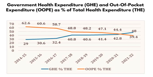 ସରକାରୀ ସ୍ୱାସ୍ଥ୍ୟ ବ୍ୟୟ (ଜିଏଚଇ) ବୃଦ୍ଧି ପାଇବା : ୨୦୧୪-୧୫ରୁ ୨୦୨୧-୨୨ ମଧ୍ୟରେ ସ୍ୱାସ୍ଥ୍ୟ ଖର୍ଚ୍ଚରେ ସରକାରଙ୍କ ଯୋଗଦାନ ଜିଡିପିର ୧.୧୩%ରୁ ୧.୮୪% କୁ ବୃଦ୍ଧି ପାଇଛି, ଯାହା ଦ୍ୱାରା ସାର୍ବଜନୀନ ସ୍ୱାସ୍ଥ୍ୟସେବା ସୁବିଧା ଏବଂ ସେବା ବୃଦ୍ଧି ହୋଇପାରିଛି । ଏହି ବୃଦ୍ଧି ସ୍ୱାସ୍ଥ୍ୟସେବାକୁ ଅଧିକ ଶସ୍ତା ଏବଂ ସୁଲଭ କରିଥାଏ, ଯାହା ବ୍ୟକ୍ତିବିଶେଷଙ୍କ ପକେଟରୁ ଅତିରିକ୍ତ ଖର୍ଚ୍ଚର ଆବଶ୍ୟକତାକୁ ହ୍ରାସ କରିଥାଏ (ଏନଏଚଏ ୨୦୨୧-୨୨)।