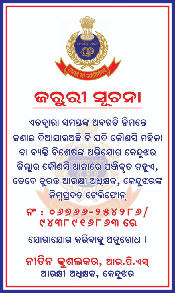 ଏହି କାର୍ଯ୍ୟକ୍ରମ ରେ କୌଣସି ଥାନରେ ଯଦି କାହାରି ଅଭିଯୋଗ ପଞ୍ଜୀକୃତ ନହୁଏ ତେବେ ଜିଲ୍ଲା ଆରକ୍ଷୀ ଅଧିକ୍ଷକଙ୍କ ସହ ସିଧାସଳଖ ଯୋଗାଯୋଗ କରିବା ପାଇଁ ହେଲ୍ପ ଲାଇନ ନମ୍ବର୍ ଜାରି କରାଯାଇଛି।