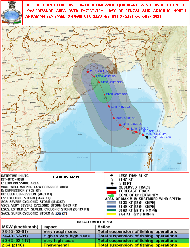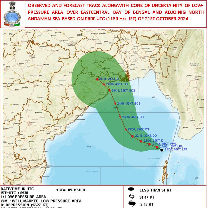 ପୂର୍ବ କେନ୍ଦ୍ରୀୟ ବଙ୍ଗୋପସାଗରରେ ବର୍ତ୍ତମାନ ସୁଦୃଶ୍ୟ ଲଘୁଚାପ କ୍ଷେତ୍ର ସ୍ଥିତିରେ ଥିବା ସମ୍ଭାବ୍ୟ ବାତ୍ୟା ସମ୍ପର୍କରେ ଭାରତୀୟ ପାଣିପାଗ ବିଭାଗ ମହାନିର୍ଦ୍ଦେଶକ କମିଟିକୁ ବିସ୍ତୃତ ସୂଚନା ଦେଇଥିଲେ। ଏହା ଧୀରେ ଧୀରେ ପଶ୍ଚିମ-ଉତ୍ତରପଶ୍ଚିମ ଦିଗକୁ ଗତି କରିବା ସହିତ ୨୨ ଅକ୍ଟୋବର ସକାଳ ସୁଦ୍ଧା ପୂର୍ବ କେନ୍ଦ୍ରୀୟ ବଙ୍ଗୋପସାଗରରେ ଏକ ଅବପାତରେ ପରିଣତ ହେବ ଏବଂ ଧୀରେ ଧୀରେ ଅଧିକ ଘନିଭୂତ ହୋଇ ୨୩ ତାରିଖ ସକାଳ ସୁଦ୍ଧା ଏକ ସାମୁଦ୍ରିକ ଝଡ଼ରେ ପରିବର୍ତ୍ତିତ ହେବାର ସମ୍ଭାବନା ରହିଛି। ଏହାପରେ ସମ୍ଭାବ୍ୟ ବାତ୍ୟା ଉତ୍ତରପଶ୍ଚିମ ଦିଗକୁ ଗତି କରିବା ସହିତ ୨୪ ଅକ୍ଟୋବର ସକାଳ ସୁଦ୍ଧା ଓଡ଼ିଶା-ପଶ୍ଚିମବଙ୍ଗ ଉପକୂଳ ଉତ୍ତରପଶ୍ଚିମ ବଙ୍ଗୋପସାଗରରେ ପହଞ୍ଚିବା ନେଇ ଆକଳନ କରାଯାଇଛି । ଧୀରେ ଧୀରେ ଏହା ଅଧିକ ଉତ୍ତରପଶ୍ଚିମ ଦିଗକୁ ଅଗ୍ରସର ହେବା ସହିତ ଆସନ୍ତା ୨୪ ତାରିଖ ରାତି ଏବଂ ୨୫ ତାରିଖ ସକାଳ ମଧ୍ୟରେ ଉତ୍ତର ଓଡ଼ିଶା ଓ ପଶ୍ଚିମବଙ୍ଗ ଉପକୂଳ ଦେଇ ପୁରୀ ଓ ସାଗର ଦ୍ୱୀପ ମଧ୍ୟରେ ସ୍ଥଳଭାଗ ଅତିକ୍ରମ କରିବାର ସମ୍ଭାବନା ରହିଛି । ଏହି ସମୟରେ ଏହା ଭୀଷଣ ସାମୁଦ୍ରିକ ଝଡ଼ରେ ପରିଣତ ହେବା ସହିତ ପବନର ବେଗ ଘଣ୍ଟା ପ୍ରତି ୧୦୦ରୁ ୧୧୦ କିଲୋମିଟର କିମ୍ବା ସ୍ଥଳବିଶେଷରେ ୧୨୦ କିଲୋମିଟର ଛୁଇଁବା ନେଇ ଆକଳନ କରାଯାଇଛି ।