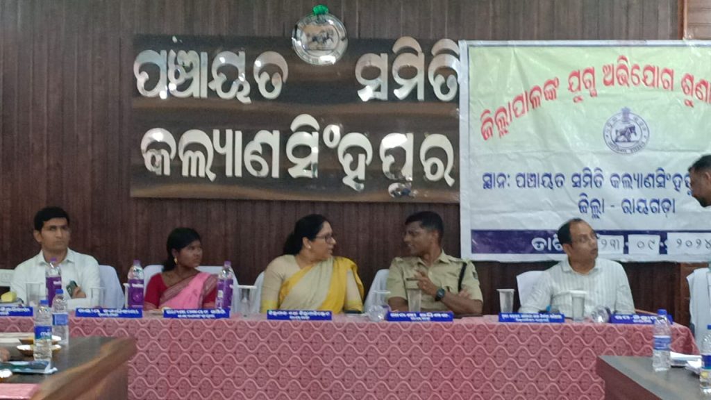 ରାୟଗଡ/କଲ୍ୟାଣସିଂପୁର( ୨୩/୦୯/୨୦୨୪) : ରାୟଗଡା ଜିଲ୍ଲା ପ୍ରଶାସନ ତରଫରୁ କଲ୍ୟାଣ ସିଂପୁର ବ୍ଲକ ସଦଭାବନା ସଭାଗୃହ ଠାରେ ଯୁଗ୍ମ ଅଭିଯୋଗ ଶୁଣାଣୀ ଅନୁଷ୍ଠିତ ହୋଇଛି । ଜିଲ୍ଲାପାଳ